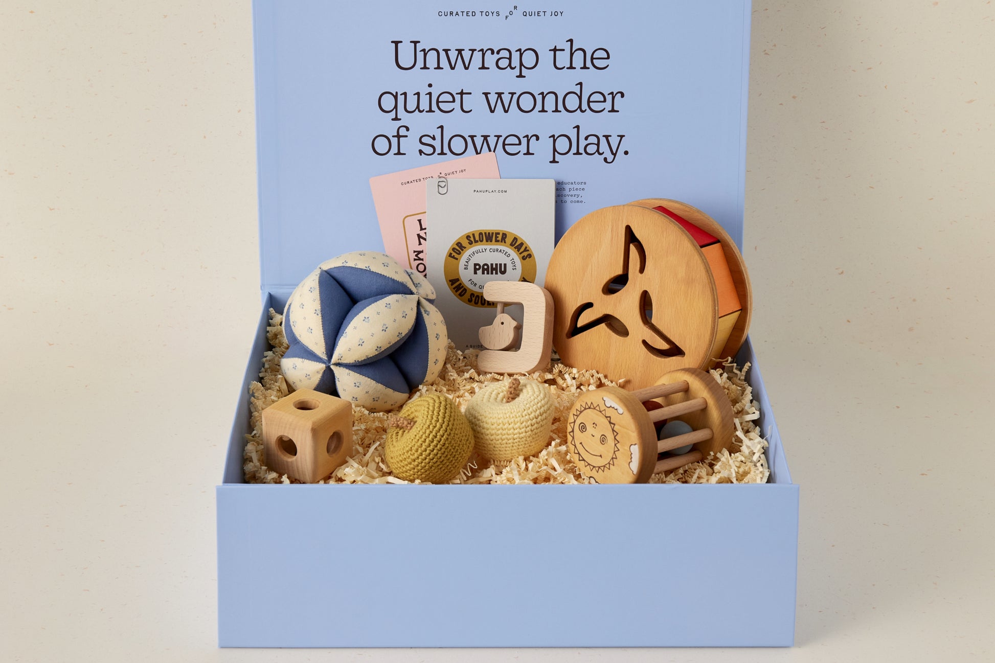 Cada caja PAHU incluye juguetes bellamente elaborados, cuidadosamente seleccionados por educadores para apoyar el crecimiento de tu bebé. Desde el descubrimiento sensorial hasta la creación temprana de vínculos, cada pieza está diseñada con un propósito y hecha para durar.